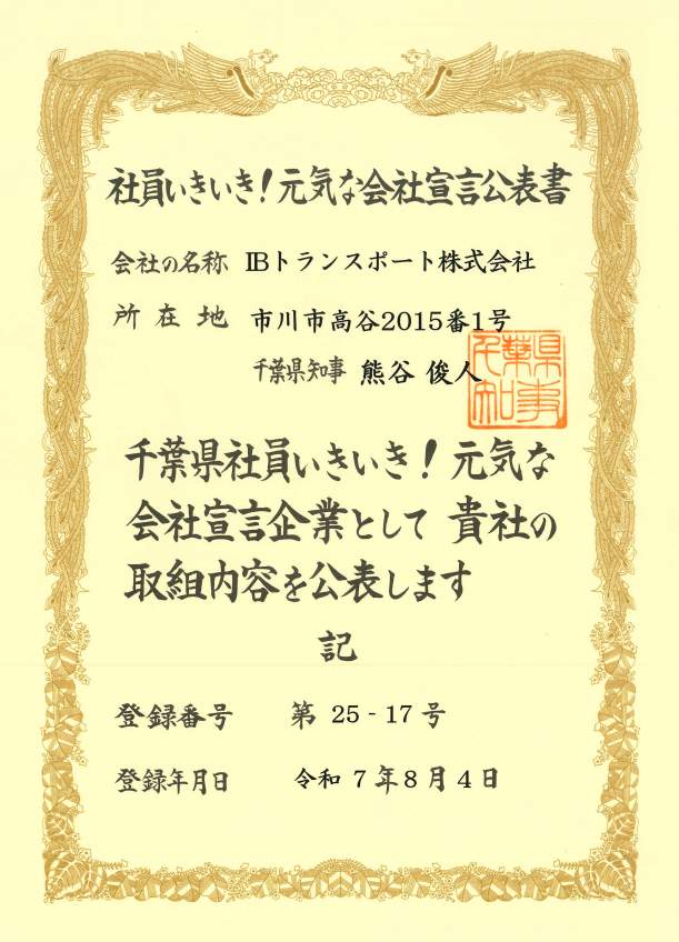 On August 4, 2025, IB Transport Inc. was officially registered by Chiba Prefecture as a “Company that Promotes Lively and Energetic Workplaces,” in recognition of our active efforts to create a comfortable working environment and to promote work-life balance.